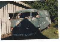 Vår alles kjære Mangokid tipset meg om denne for ca 15 år siden... Etter en første befaring dømte jeg den som fullstendig råtten og helt uten håp. Noen smådeler ble med hjem, men den brant seg fast baki hodet... Etter et par år, så hadde den "blitt bra nok" og den måtte hjem... Bakakslingen var borte...og det var rammevangene også. Med steinsvans bak en gammel M35, ble varebilden bare mer og mer vridd og mer og mer råtten...så enda en gang ble den dømt for dårlig... Men - som en slags siste gest, så skrev jeg mitt navn og nummer med sprittusj på den ene frontruta. Ett år senere fikk jeg plutselig en telefon... "vi driver og rydder en gammal gård her, og nå henger det en gammel folkevognbuss i gaflene på hjullasteren her...så ble vi var ditt navn og nummer som sto på den....skal du ha den?" ..... ehhh - ja! Jeg henter den i kveld..