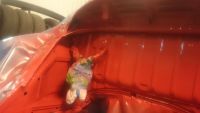 Så blir det å slipe/ matte ned motorrommet utenom rundt rammene da det ble gjort i stad, før grunning og lakkering av motorrommet.  bakskjerm spissene får en runde med steinsprut beskyttelse før lakk.