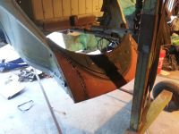 Frua rakk å slipe blank ei dør før krampa tok henne ;-) i kveld, fikk jeg besøk og GOD hjelp av en kompis, Arne , som slipte blankt panseret og høyre bakskjermen+ hjalp meg å justere inn venstre forskjermen skikkelig. det gjorde at jeg fikk fullført bakplata, justert og sveisa den fast, slipt sveiser, og tinna alle skjøter og slikt på bakplata, da kan jeg slipe tinn å sparkle den klar i mårrakveld etter jobb tenker jeg . fikk og sveisa ferdig alle småhulla i bakskjerma til div lampefester. da er det klart til å borre nye hull etter hvert der og.