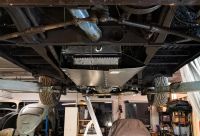 På hver side av motoren går det to 8mm stålplater som vil ta nedi før sumpen, og for å få plassert tverrbjelken riktig lagte jeg spacere av noen gamle ventilerte bremseskiver. Gliser