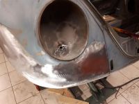 Da jeg ikke ville begynne på selve bilen før alt av papirer var i orden og biltilsynet var fornøyd med skifteattest og salgsmeldinger fra tidligere eiere, begynte jeg å redde en skjerm i stedet. Var litt rust i bunn av lyktebrønn som ble kuttet bort.