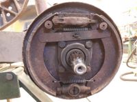 Her fra et bakhjul hvor wire kommer inn i toppen og vipper på mekanismen slik at bremseskoene blir presset fra hverandre.