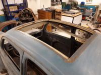 Da var soltaket ute, og kun restene av taktrekket igjen. Ville helst ha det også mest mulig helt ut for å kunne bruke det som mal. Regner med jeg må kjøpe et til vanlig tett bil og klippe til, samt kjøpe noen meter stoff ekstra for å sy innertaket til soltaket selv.