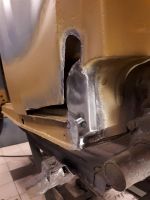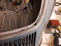 Da jeg ikke ville begynne på selve bilen før alt av papirer var i orden og biltilsynet var fornøyd med skifteattest og salgsmeldinger fra tidligere eiere, begynte jeg å redde en skjerm i stedet. Var litt rust i bunn av lyktebrønn som ble kuttet bort.