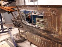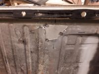 Har nok ligget en del vann på gulvet, for under batteri og frem til passasjersetet var det mye rust. Kjøpte reprodel til dette, men måtte selvfølgelig modifisere denne litt. Firkanten for batteriet er nok tilpasset høyspentbiler (12volt). Her har jeg tegnet om slik at profilene stemmer bedre med originalgulvet og 6volt batteriet.
