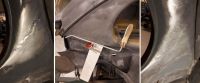 I dag ble det litt finretting av innsiden på C-stolpen. Den ble jo grovrettet når den sto i jiggen og ble trekt ut, men fortsatt en del småbulker. Siden jeg har kuttet bort en del på utsiden, kom jeg til med en bøyd stålstang. Brukte en trebit som mothold for å spre kreftene fra stanga. Fikk dyttet ut mesteparten, men litt sparkel blir det nok.