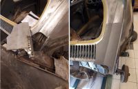Leverte den til Berntsen Karosseri for å få trukket ut litt bulker i bakenden. Fikk den opp på jiggen og festet den ved å ta av torsjonslokkene bak og skru fast tykke stålplater der som ble skrudd fast i jiggen. Så var det å feste klyper, og trekke/jekke samtidig som det ble slått på bulkene.