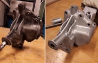 Så var det starteren sin tur. Så ikke så pen ut, så sandblåste den før jeg plukket den fra hverandre. Men innvendig så den ny ut, så målte litt og satt den sammen igjen med nytt fett i lager. Den er merket 4P som er datomerkingen til Bosch. 4 betyr april. og P er kode for 1958.