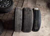 Til venstre, vinterdekk 165/65-15, i midten et gammelt 205/60-15 som vi tenkte å prøve bak, og til høyre nye 165/65-15 fordekk.