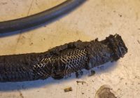 Vi mistenker at dette er en slange som jeg har brukt ca 10 år på Ghian, så det kan hende den allerede var noe skadet, men hull var det i alle fall. Den er så gammel og stykk at jeg er ikke sikker på om det er en slange fra biltema eller fra en annen leverandør, da jeg har kjøpt fra flere steder over de siste åra. Moralen er vel å holde slangene unna eksosen, uansett fabrikat Glad