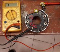Bytter regulatoren. Ingen endring, altså er feilen i dynamoen. Børstene sjekket og OK. Måler strømmen etter Svein T's utmerkede bruksanvisning. OK, der har vi feilen, bare 1,5 V!!!.