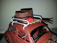 Kom over et metalldeksel på qxl etter gammelt. måtte blø hele 21 spenn for det.. litt primer lakk fra biltema, og en halvtime med sprittusj på panser.. Miniz felger og dekk(bakdekkene fikk seg en runde med "vinduspakning".. Understellet er også fra et mini-z karosseri som jeg måtte forlenge for å få riktig avstand mellom hjulene..øyelokk og caps fra en brusboks Glad Takgrind ble laget av 2.5 kvadrat`s elkabel, kuttet,bøyd og loddet sammen.. og fikk seg et strøk lady interiørmaling Glad Måtte i frysen å finne to pinne-is.  Gliser, for å få materiale til å lage skiene og trespiler på grinda. stavene er noen grillspydpinner.. Glad