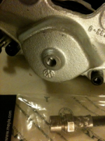 Bilde viser enden på bremseslangen samt inngangen på kalipteren.  Glad