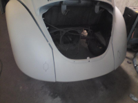 Dette er langt fra en original bil, og den er ikke strøken. Det er igjennsveist det som er av unødvendige hull i karroseriet, og sveisene er tinn sparklet. Den er kun lakkert i noe epoxy grunning, så den ikke skal trekke fukt.