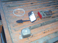 par år gammalt spegl med fester for gammal type solskjerm 80kr, askebeger 20kr, speedokromring 20kr, laderele 6 volt i god stand 400kr