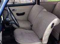 Innvendig ser den litt sliten ut. Førersetet har ødelagt rygg. Alle setene bør sikkert trekkes om, men fjærene er hele.