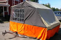 Duken er fin og taket (gummiert) er tett. Det er en liten rift øverst i mønet på motsatt side av inngang. I tillegg er lokket lappet/forsterket med glassfiber på noen av festene. Det medfølger tidsriktige puter til sittegruppa, samt gardiner til vindu. Teltet henger løst på bildene, men blir stramt når festet i bakken. Det følger med plugger, gummihammer med mer.