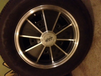 Det sitter dekk på, rett og slett fordi jeg ikke har tatt meg bryet med å ta dem av ennå. Ergo sender jeg dem gjerne med. Foran er det 145/65x15 og bak 165R15 Firestone F560. Dekkene er ikke av nyere dato, men har masse mønster.