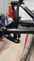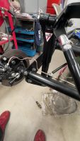 Også er jeg litt usikker på hvordan det går med fjæringsvei og stagene ned på rammegafflene. Syns det er farlig liten klaring nå som den henger med hjula fritt. Kan ikke se for meg at det går bra med vekt på  hjula. hmm