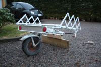 Produsert av “Järn og Stålprodukter” i Borås tidlig på 60 tallet. Fin stand. Mangler baklys pluss ledning og plugg. Den mangler også fester til bilen. Lengden på hengeren kan varieres fra 0,5-1m. Når den ikke er i bruk kan hjulet tas av og den henger kun på festene.