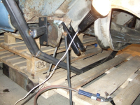 Foran er samme prosedyre. Jeg senket bilen slik at den stod på rammen bak slik at jeg kunne vatre opp bilen før jeg sveiset rammen foran. Platene ble boltet til bilen, stagene tilpasset og plassert slik at bilen var sentrert i rammen og punktet fast. Det er nå altså viktig at rammene står slik at sidene står parallelt for å hindre at den vipper. Ut over det horisontale staget her kan en gjerne også forsterke med en horisontal plassert like under festeplaten. (Jeg har ikke hatt behov for det, men så er min 100% ribbet også)