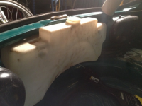 I påvente av at bremsesylinderen skal komme tilbake fra overhaling så har jeg begynt og montere ny spylertank. For og slippe og være avhengig av luft fra reservehjulet så bygger jeg om til elektrisk pumpe. Det originale spylerbryteren var allerede klargjort for elektrisk spyler, måtte bare lodde på en ledning. Jeg var så heldig at jeg har fått tak i en spylertank fra biler med lyktespyler, den har bare en nippel for spylerslange i bunn. Jobber var og lage fester, strekke strømledning til pumpe og forlenge spylerslangen.