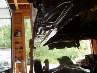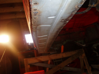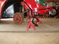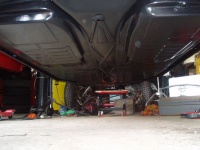 Så prøvde eg litt,, ja det skulle gå dette her, og snart var bunnplata komt under bilen og bilen/karosseriet var oppi lufta og på bokk. Såvart bunnplata lina og lodda 100% opp under karosseriet. og karosseriet vart vatra opp nøyaktig til 0. På den måten kunne eg plassera kanalbunnen på karosseriet og bruka lodd for å sjekka kor skruehola traff botnplata. På den måten sparte eg all den vanskelege løftinga av karosseriet!
