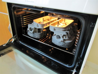 Fikk banket inn nye ventilstyringer i går. Var oppe en tur hos Svein T for litt missbruk av steikeovnen hans  Toppene blei vasket i sterk avfettig og stemaet skikkelig reine dagen før. Toppene inn i ovnen på 200 grader i rundt 20 min for litt utvidelse av godset. Så brukte vi et tilpasset neddreid stål med ca. 8 mm stamme for å banke inn styringene. Vi banket inn eksosstyringene først, da styringshullet i eksosen visstnok er hakket trangere enn styringshullet på innsugssiden - Har sikkert med varmedifferanser å gjøre ved driftstemp. I steikeovnen!