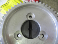11 Delene klare.jpg (124.92 KB. 1024x768 - vist 380 ganger.) Neste ut er kammen. Her er det kun kamdrevet som skal på plass med tre bolter. Jeg forsikrer jeg med med gjengelåsing og låseskiver. Av ren ydmykhet valgte jeg å bruke de boltene som fulgte med kammen. Husk å trekke til med boltprodusentens anbefalte moment! Kamdrevet er fra Eagle. Ikkeno' fancy dyrt kamdrev, men jeg har brukt dette med suksess flere ganger før. Nå er det én felle å gå i som en skal passe seg for. Kamdrevet kan settes på tre forksjellige veier, men naturligvis er kun én vei riktig. I midten av kamdrevfestet bakerst på kammen er det et tykt frest spor som tegner diameteren over sirkelen. Dette sporet er for å drive oljepumpedrevet. På kamdrevet er det en prikk som er til for å sette registeret riktig (husker du de to små prikkene på registerdrevet på veiva?). Denne prikken skal lines opp med det freste sporet langs diameteren til kamdrevfestet.