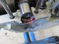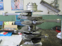 05 Klar i bukken.jpg (111.49 KB. 1024x768 - vist 382 ganger.) Her er DPR-VeiWa klar for montering av lager og div. veiv-hardware. Propanblåseren er til oppvarming av de to drevene som skal på. Sveisehanskene bruker jeg når drevene skal installeres i temmelig varm tilstand.