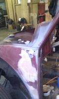 I dag ble det godt oppmøte i verkstedet, og jeg var på plass tidlig for å få gjort litt. Jeg fant ut at jeg mangla pensel til flussmiddelet for tinnsparkling, ser ut til at litt bedre gjønnågang av verktøy og utstyr hadde vært lurt. Får høre med Meltveit Kleppa om hun har noe råd.. Så det ble påført litt glassfibersparkel isteden rundt på taket der hvor sveiseskjøten til ragtop'en er