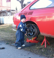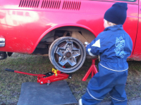åj god lesning at du har vert på kjøretur ole bole  Jepper.. Og mere blev det faktisk til!  Jeg var lidt rastløs og jammen om ikke min kære Hege sagde: Kør dig da en tur når du nu har de skilte resten af dagen.  Og vupti, så sad jeg i bilen med armen ud af vinduet på vej ud til Anders for se hvordan fremgangen var med varianten. Og ikke mindst et par vise ord med til Fastback'en. Dommen blev vel at styresnekken skal ses på (har en ekstra i tilfælde) og at den venstre kaliper henger. Felgen var ganske lun da vi havde testet med Anders bag rattet. På vej hjem fandt jeg en lille plads med grus og trampede på pedalen. 3 striper blev det til, ingen fra venstre forhjul  Heldigvis har jeg lånt et "motions-verktøj" til kaliperen så får vi se om det kan hjælpe.. Ellers har jeg afmonteret fangerne for og bag, og det kan næsten se ud som den fortsætter sådan  Et hak ned foran og så med krom felge til en start..  Mulig cal-look emne her?
