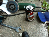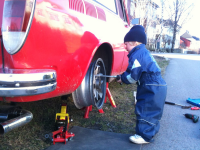 Hyggelig med litt kose tid i garasjen også  Om en ikke får gjort stort bestandig, betyr heller ikke noe så lenge man har litt godt drikke   Ellers blev det til sofatid i aften med kone og den lille ny, men Sebastian var da med og aflevere felge for nyt gummi på Tønsberg Vulk. 145/65 front og 185/60  Starter med ståliser og så må kagefælgene vente lidt i kulissen.