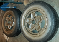 Begynte med et "før" bilde av cookie-cuttersa med 175-dekk, mest for å måle klaring til felgen: