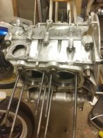 Fortsatt ikke noe kamdrev, men jeg begynte så smått med å forberede sluttmontering med å renske blokkhalvdelene for alle løse deler og plugger. Så tok jeg de med ned på den lokale statoil-stasjonen hvor de fikk seg en god omgang med avfetting og høytrykks-spyler. Så nå er alt gullende rent, og monteringa er så smått påbegynt. Kosejobb Glad