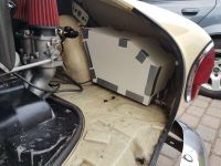 Så da prøvemonterte vi oljetank-mockupen, og det blir bra tror jeg. Den stikker ca 10 cm ned i hullet ved siden av "hylla" rundt motorrommet, så håpet er at det ikke skal lekke for mye olje gjennom pumpa og inn i motoren når den står stille. Håper å slippe å montere en eller annen form for ventil.