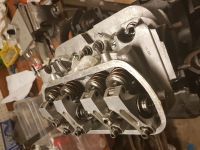 Fikk prøvemontert toppene, og etter at de ble maskinert 2 tideler passet sylindrene og nå ser det i alle fall ut som en longblock selv om innmaten ikke er montert ennå:
