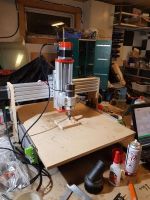Geometrien stemte med simulering så da overføres designet til aluminium. Siden cnc-maskinen ikke helt er satt opp for aluminium ennå grovskjærer vi med rotterumpe og bruker kontur-bit på en overfres for å duplisere designet. Her er alubiten grovskjært