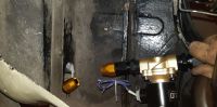 først var det mye måling og fundering for å finne ut hvor i innerskjermen jeg må ta opp hull. Det jeg ikke hadde tenkt på er jo at det sitter en fangerbrakett akkurat der hvor det hadde passet best, men etter en time eller to med sliping og knoting, ser det ut omtrent som det her: