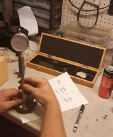 Før vi bruker for mye tid å penger på denne blokka, tenkte vi det var lurt å sjekke om den trenger linjeboring, så da fant vi frem et mikrometer i passe størrelse, og en "bore dial guage" for å måle lagerbukkene innvendig.