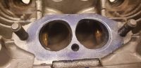 Jeg tok utgangspunkt i de originale hullene, åpnet diameteren med 2mm og rundet av litt i et par av hjørnene, og endte opp med ca 15% større areal. Jegbruker CB sine innsugsrør, og har heller ikke gjort så mye lenger nede i innsugsportene, så jeg forventer ikke 15% effektøkning fra dette Blunker Mest for å prøve meg litt og finne arbeidsformer som funker for evt senere porting Glad