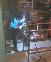 Etter litt grubling fant vi ut at vi måtte smale inn ramma til arbeidsbenken ca 3 cm, så da var minstemann på 14 fornøyd siden da fikk han sveiset litt igjen Glad