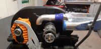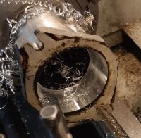 Vi kikket også litt på det korte røret mellom spjellhuset og kompressoren, og kom til at vi kunne jo spenne opp i dreiebenken for å lage en fin traktform i overgangen fra spjellhuset til røret: