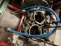 Når jeg bygde denne motoren for 12-13 år siden lakket jeg blokka, men etter så mange år og mye skruing så ikke det veldig pent ut, så jeg fjerner lakken med litt tynner og en stålbørste så da blir den blank og fin. Dette er jo alu-blokk så den holder seg gjerne litt penere enn en T1 blokk som blir sort etter en liten stund i friluft.