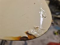 Det ser jo ikke spesielt bra ut, og mest sannsynlig har det kommet fukt innunder lakken og liggert der og godgjort seg et par år. Det var ikke mye sparkel på dette området; kanskje bare maks 1mm tykkelse inkl grunning og lakk.