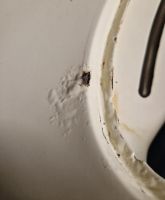 20241028_182209.jpg (47.42 KB. 522x600 - vist 544 ganger.) Jeg hadde bare tinnet over dette hullet, så det kan jo het klart være en av årsakene til problemene; Det spruter vann og søle opp fra framhjulet og det kan ha kommet fukt opp under grunning/lakk. Så da fikk jeg Atle til å sveise igjen hullet, og når metallet ble varmt fra sveisen, så smeltet litt mer tinn, og flere hull dukket opp... Så da slipte vi et litt større område, og sveiset igjen de hulla som dukket opp  Jeg satte ei arbeidslampe inni skjermen, og lyste opp i skjermen, og alt tyder på at porene ikke går gjennom metallet, så det er jo antakelig godt nytt, Før jeg fokuserte på et par andre saker, la jeg på et par lag med epoxy så ikke det kommer mer overflaterust før jeg endelig bestemmer meg for hva jeg gjør med dette: