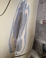 20241028_182209.jpg (47.42 KB. 522x600 - vist 542 ganger.) Jeg hadde bare tinnet over dette hullet, så det kan jo het klart være en av årsakene til problemene; Det spruter vann og søle opp fra framhjulet og det kan ha kommet fukt opp under grunning/lakk. Så da fikk jeg Atle til å sveise igjen hullet, og når metallet ble varmt fra sveisen, så smeltet litt mer tinn, og flere hull dukket opp... Så da slipte vi et litt større område, og sveiset igjen de hulla som dukket opp  Jeg satte ei arbeidslampe inni skjermen, og lyste opp i skjermen, og alt tyder på at porene ikke går gjennom metallet, så det er jo antakelig godt nytt, Før jeg fokuserte på et par andre saker, la jeg på et par lag med epoxy så ikke det kommer mer overflaterust før jeg endelig bestemmer meg for hva jeg gjør med dette: