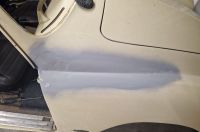 Ble et par timer i garasjen i dag og, inklusiv besøk av en hyggelig danske  Jeg begynte med å sandblåse det området på toppen av høyre forskjerm for å få ut alt av disse porene, og da oppdaget jeg at jeg antakelig har jukset litt for sånn 15-16 år siden: