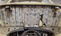 Jeg hadde en periode en plate på der som var trukket med skai, men etter en liten motorbrann innså jeg at det var en dårlig ide, så tanken var å fjerne disse butyl-platene og begynne litt fra bunnen av igjen.