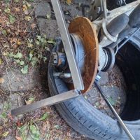 Glemte selvsagt å løsne sentermutterne på bakbremsene når bilen sto på hjula så jeg tenkte det var smart å bruke et firkantjern til å holde igjen mellom pinneboltene, men første forsøk var ikke helt vellykket:
